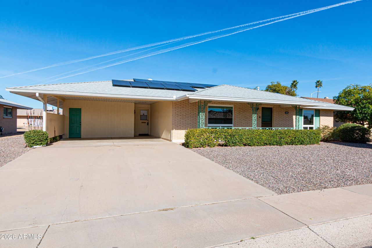 Easy living floor plan, low maintenance 2bed/2bath! Meticulously maintained CHARMER in the heart of 55+ Sun City Community. The updates are expansive: newer roof with privately owned solar panels placed just last year,new appliances 2025, new windows and more. Upgraded baths, and Clean contemporary kitchen, with separate dinning area, off a large l-shaped carpeted living room. Great interior storage and spacious closets. Full size exterior laundry room with side workshop and front and back yard access. Screened in sun room,with large clean backyard and a large metal storage shed. Close to all Sun City Amenities including Recreational center, 8 pools,8 sports courts, 2 bowling alleys & almost 150 clubs. This home is a fabulous find if want to move right in and enjoy life.