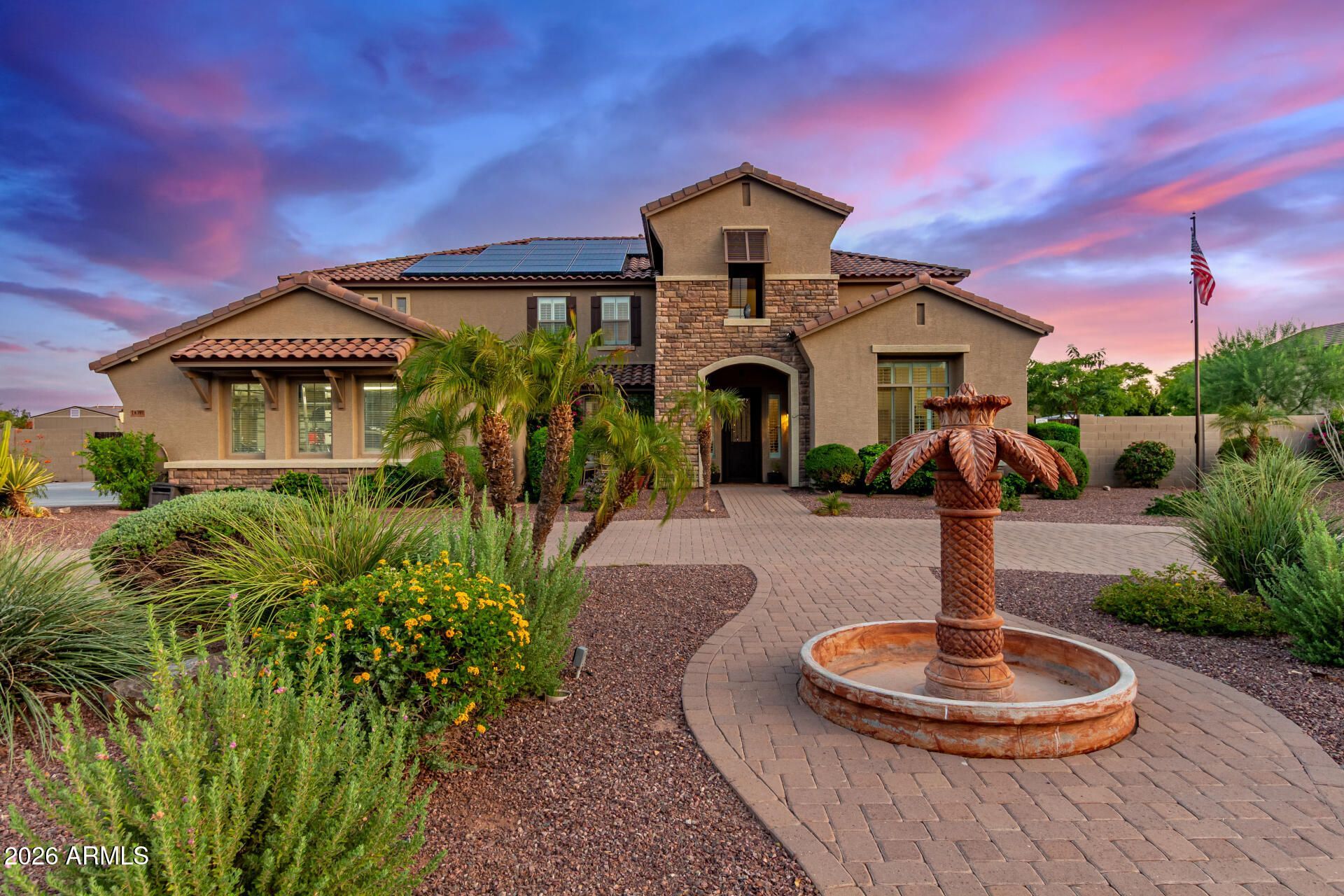 Welcome to your private resort retreat--right in your own backyard!This meticulously crafted masterpiece seamlessly marries timeless sophistication with contemporary luxury, where every space invites effortless living. Leased solar panels keep things eco-smart and efficient, dramatic stone accents add curb appeal drama, and the sweeping circular driveway sets a grand first impression. Practical meets pampered with dedicated RV parking and a cavernous four-car garage complete with custom cabinetry and dedicated workbenches--perfect for hobbyists, car enthusiasts, or weekend warriors.Step inside to soaring ceilings, sleek tile floors underfoot, and pre-wired surround sound ready to soundtrack lifes best moments. Plantation shutters frame picturesque views, while a serene neutral palette creates a warm, inviting canvas for your personal style.Gather in the expansive living room, savor formal dinners in the elegant dining space, or unwind by the cozy fireplace in the welcoming family room. The show-stopping gourmet kitchen is every chefs fantasy: premium Wolf and Sub-Zero stainless steel appliances (including double dishwashers and a warming drawer), granite counters and backsplash, rich wood cabinetry, a generous walk-in pantry, a center island, and breakfast bar seating.Need inspiration or focus? The versatile den transforms into a chic home office or creative haven.Escape to the luxurious primary suite, where a spa-inspired bath and glamorous makeup vanity await your daily rituals. Movie lovers will obsess over the expansive media room featuring a ceiling-mounted projector and immersive surround sound--your personal cinema awaits cinematic nights in.Entertain like never before in the bonus room with its sleek wet bar--ideal for game nights, cocktail hours, or spontaneous celebrations.Now the real magic: the breathtaking resort-style backyard that turns every day into vacation mode. Dive into the sparkling pool (complete with diving board for endless summer fun), spike a volleyball on your private court, lounge on the covered patio, fire up the grill, or simply soak up the sun in your ultimate outdoor sanctuary. Ample space for al fresco dining, family gatherings, or hosting friends wholl never want to leave.Recent upgrades ensure peace of mind: New Roof (2025) New AC Units (2021, 2023, 2025) New Water Heater (2022)This isnt just a home--its an enviable lifestyle of luxury, convenience, and endless enjoyment. Properties like this dont linger. Take your private tour today and see why this is the one youve been waiting for!Please see attached documents for full details, floor plans, and more.