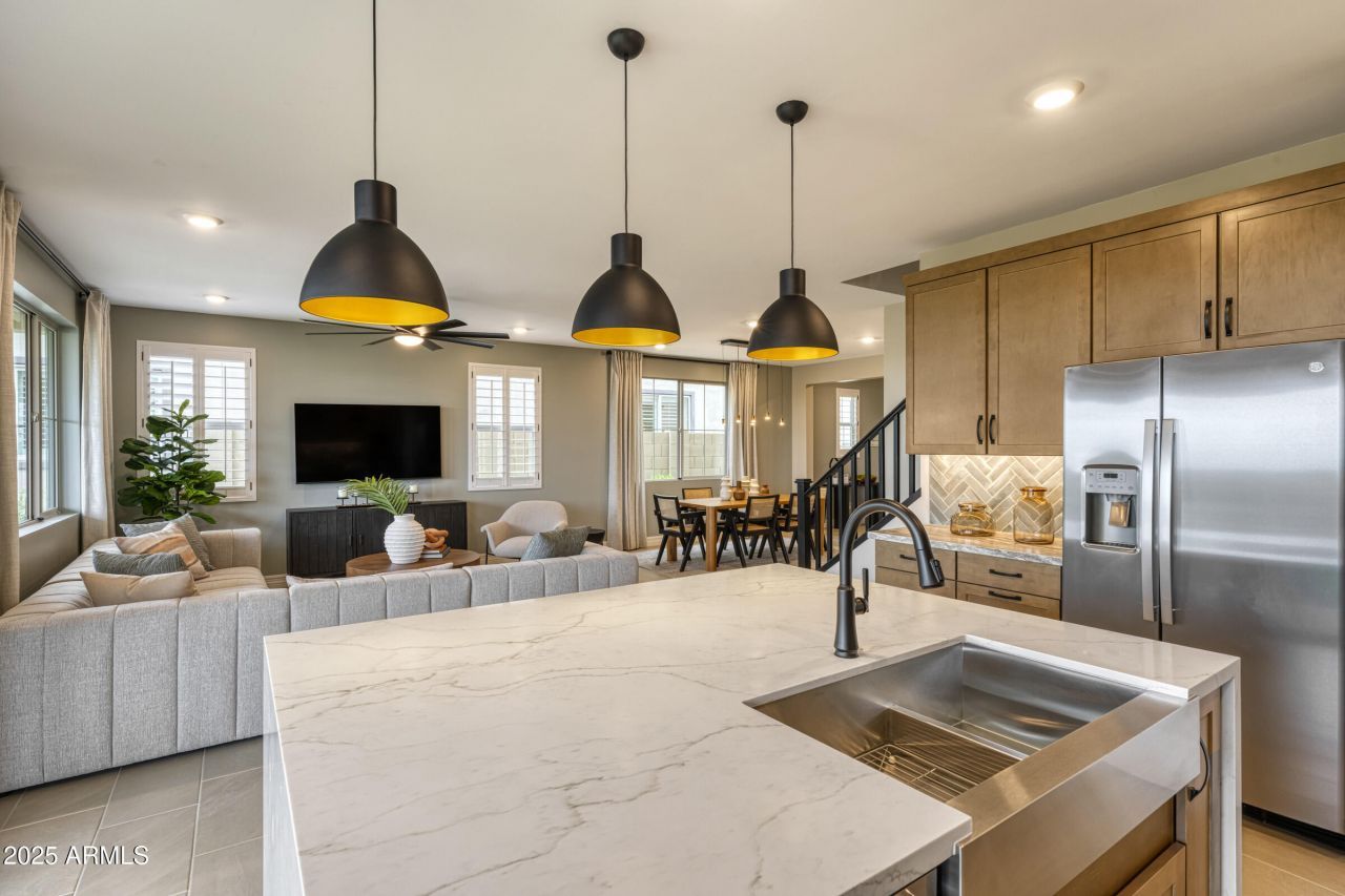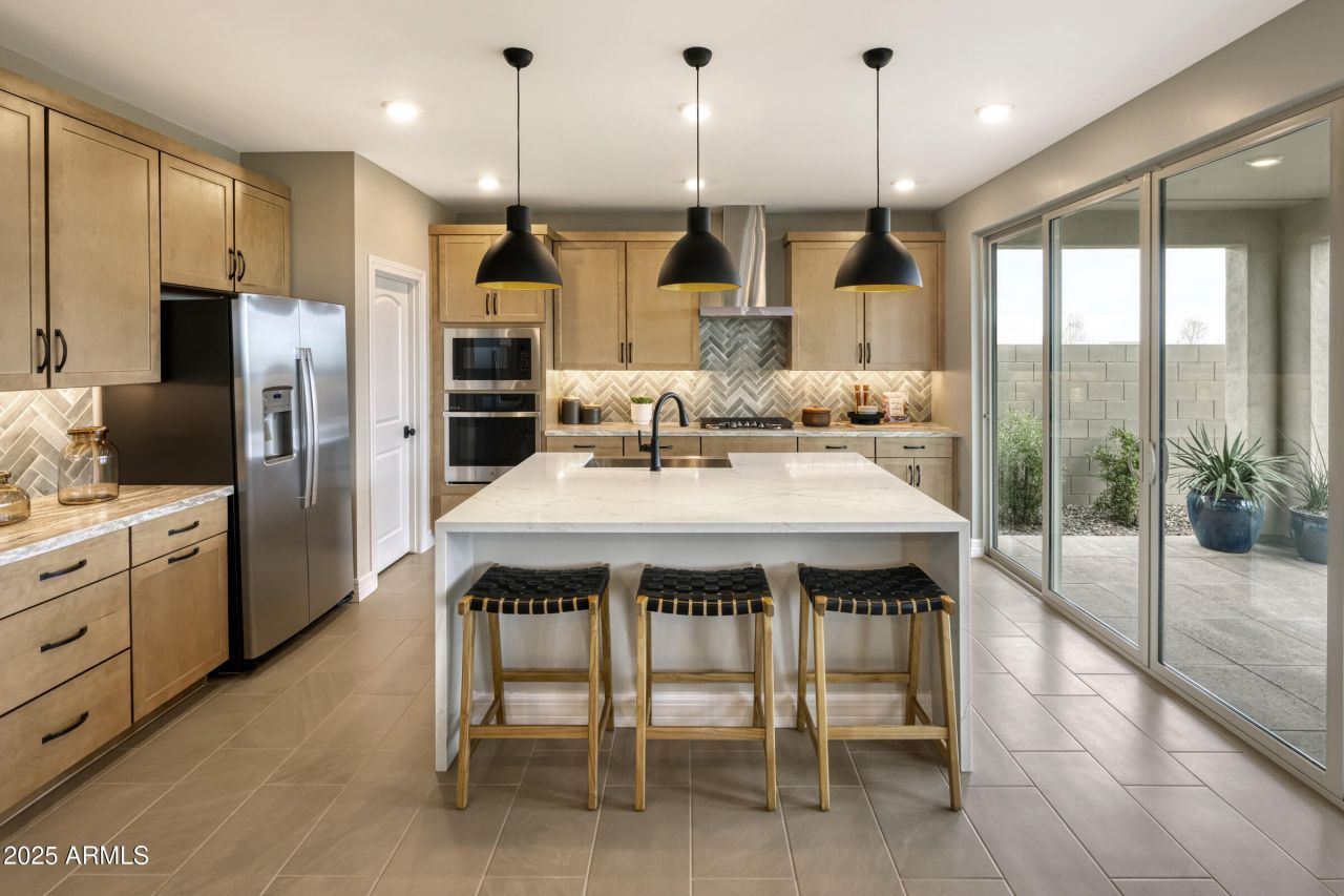 Immaculate, model home, located at Vireo at Waterston Central, featuring 5 bedrooms, a loft, an extended covered outdoor back patio, an attached 2-bay garage, and luxurious upgrades throughout! The Gourmet kitchen, a focal point in the home, includes a GE Profile 30 built-in gas cooktop and stainless steel appliance package including a refrigerator, a 18 recycle center, marble countertops with tile backsplash, a Delta touch faucet in matte black, and Diamond Signature Series Bryant Maple Buckskin cabinetry (also featured throughout the home). Other notable features include a 12 center pull slider at the kitchen, 12 x 24 wood look tile flooring, a washer and dryer in the laundry room, front and backyard landscaping with a private backyard, and more!