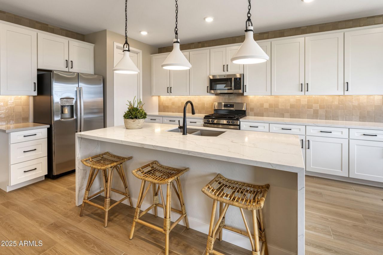 Beautifully designed desert-style 2-story home previously used as a model home for Vireo at Waterston Central, featuring 4 bedrooms, 2.5 bathrooms, an office, loft, outdoor living spaces, an attached 2-bay garage, designer upgrades, and so much more! Highlights in the kitchen include a GE stainless steel appliance package with a 30 free-standing gas range, dishwasher, microwave and refrigerator, a 18 recycle center, quartz countertops with custom tile backsplash, and a Delta Essa Touch faucet in matte black. Other highlights include a washer/dryer, Diamond Signature Series Breman Maple White cabinetry throughout, wood look tile flooring, lower/upper cabinets and a sliding glass door at dining room, window treatments, pavers at the driveway, walkway, and front porch, and more!