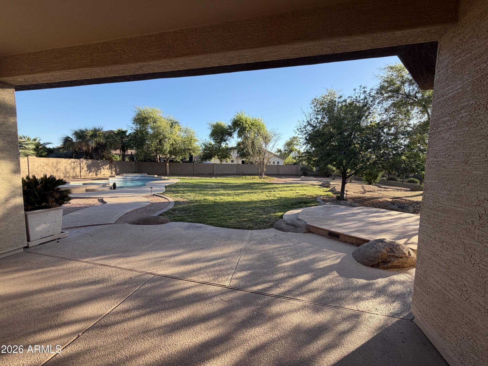 Beautiful single-level home in Power Ranch featuring 4 bedrooms, 3 bathrooms plus a den (optional 5th bedroom) and 3,119 sq ft of living space on an 18,504 sq ft corner lot. Split floorplan with 9+ ft ceilings, formal living and dining, and a spacious family room with gas fireplace. Kitchen includes granite countertops, gas cooktop, island, walk-in pantry, and breakfast area. Primary suite offers walk-in closet, double vanity, separate tub and shower. Backyard features heated pool and spa, covered patio, grass area, and RV gate. 2.5 car garage with cabinets. Located near community lakes, parks, trails, and amenities. Higley Unified School District.