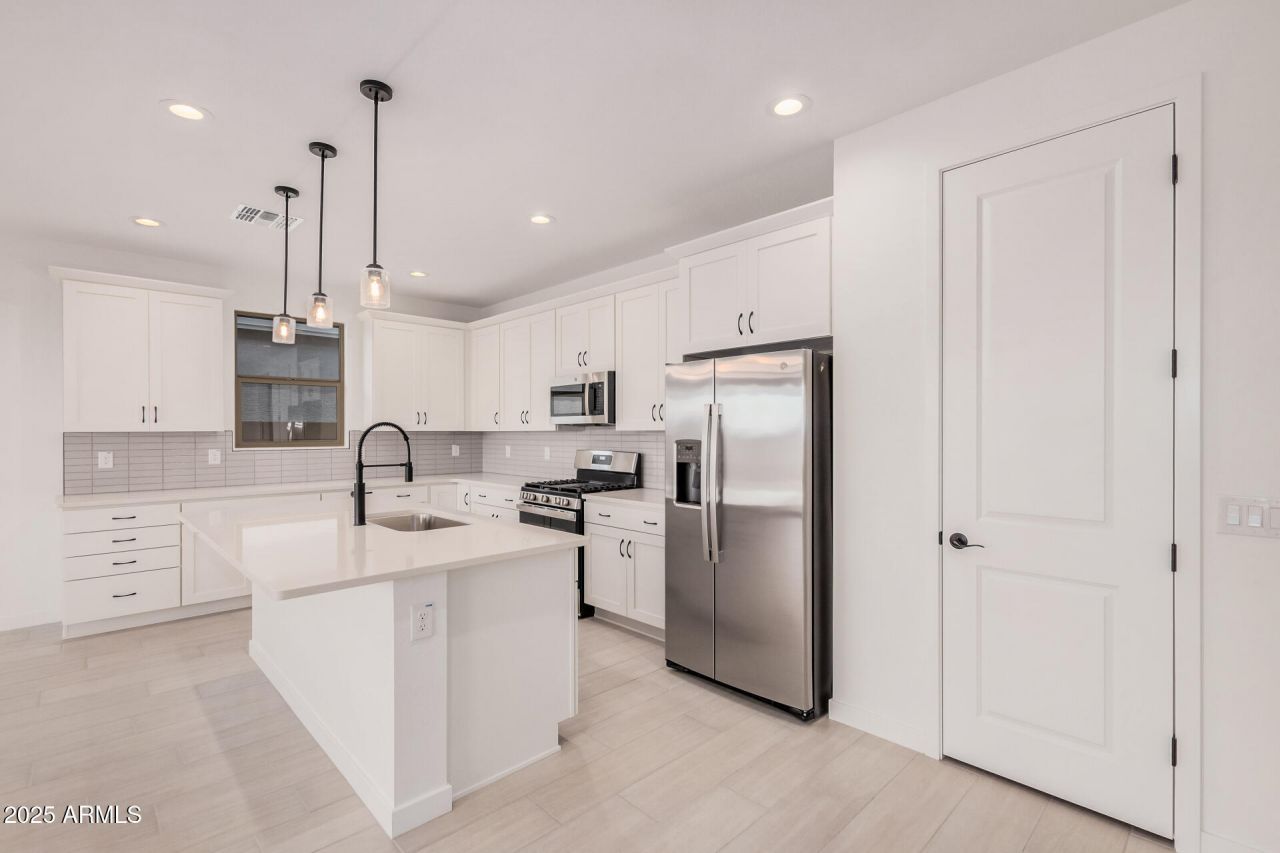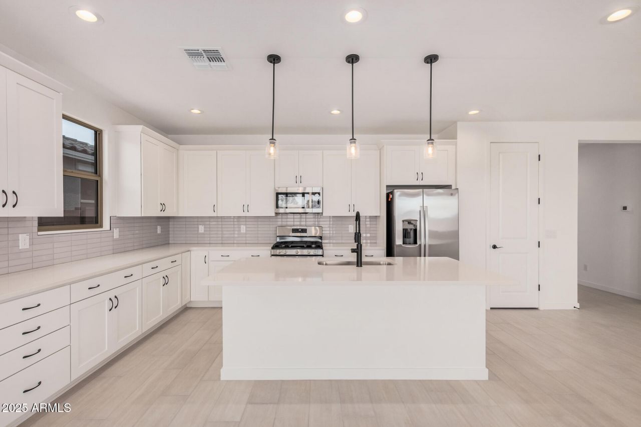 Explore this inspired Agate home, ready for quick move-in on a premium CORNER LOT! Included features: a covered entry; a corner kitchen boasting 42 upper cabinets, stainless-steel appliances, a center island and an adjacent dining room; a large open great room; an elegant primary suite showcasing a large walk-in closet, floor to ceiling shower tile, and double sinks; a central laundry; two additional bedrooms and one additional bathroom; a wonderful flex room, covered patio and a 2-car garage. This home also features 9x35 ceramic tile flooring, quartz kitchen countertops, 8 doors, 9 ceilings, and ceiling fan prewire in all bedrooms, great room, and patio. Youll also find a stainless-steel side by side refrigerator, tankless gas hot water heater, soft water loop. garage coach light front yard landscaping and pavers at the driveway and entryway. Plus much more!