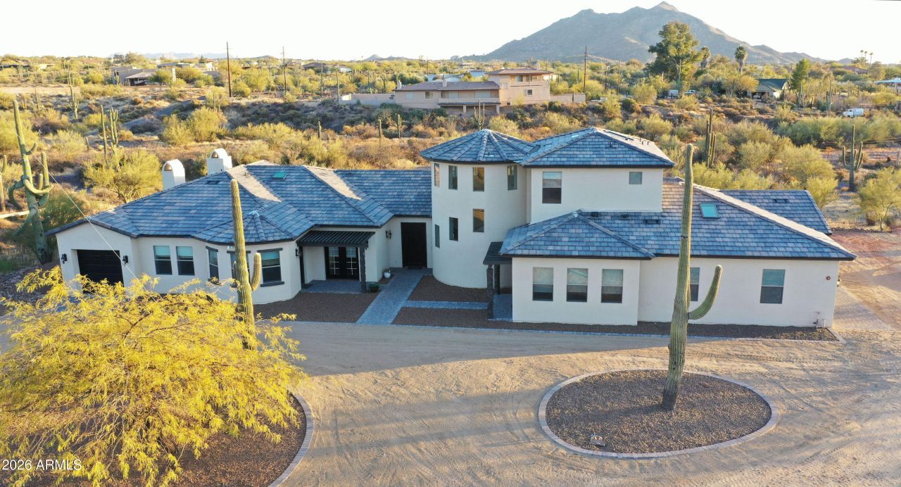Stunning Sonoran Desert setting on 2.2 private acres with mountain views and breathtaking sunsets. Thoughtfully designed 5 bedroom open layout, chefs kitchen with large island, butlers pantry and premium appliances. Primary bedroom with gas fireplace and dual custom closets. Upstairs guest suite with bedroom, sitting area, full bath and balcony. Covered patio and fireplace open to natural desert expanse. 4 car garage (3+1 separate bay), owned solar, Insulated Concrete Form (ICF) wall construction provides excellent insulation, newer roof. Horse property permitted.