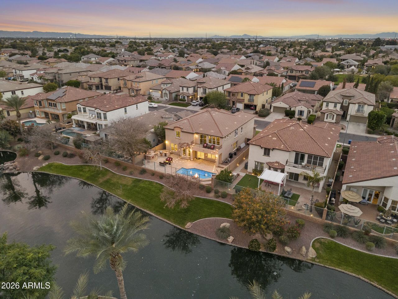 Wake up to shimmering lake views and resort-style luxury every day. This updated 6-bed, 4-bath lakefront residence delivers refined living with a grand two-story entrance, chandelier, cantera front door, freshly repainted interiors throughout and 3 Brand New HVAC units just installed! The reimagined kitchen shines with newly upgraded cabinets and quartz counters, complemented by newer appliances. All bathrooms have been recently redone with high-end quartz, vessel sinks, and spa-inspired walk-in showers. Entertain with ease in the family room with built-ins and gas fireplace, formal dining with tray ceiling, a massive loft, and a bonus media room with stage flooring. The primary suite is a true retreat, featuring a private lake-view balcony, gas fireplace, dual closets, and a stunning spa bath with dual vanities, makeup vanity, soaking tub, and multi-head marble shower. Step outside to a resort-style backyard boasting premium lakefront views, polished travertine covered patio, LED lighting, a pool with fire and water features, built-in BBQ, rose bushes, and a cozy outdoor gas fireplace. Additional highlights include a brand-new water heater, 3 brand-new AC units, surround sound, Nest thermostats, security system, and a 3-car garage with epoxy floors, EV charger, water softener, and recirculation pump - luxury living at its finest.